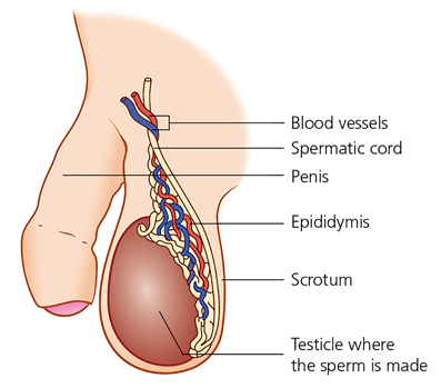 The testicles (also called testes) are part of the male reproductive system. The testicles are two oval organs about the size of large olives. They are located inside the scrotum, the loose sac of skin that hangs behind the penis. The testicles make the male hormones, including testosterone, and produce sperm, the male reproductive cells. Disorders of the testes can lead to serious complications, including hormonal imbalances, sexual dysfunction, and infertility.